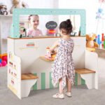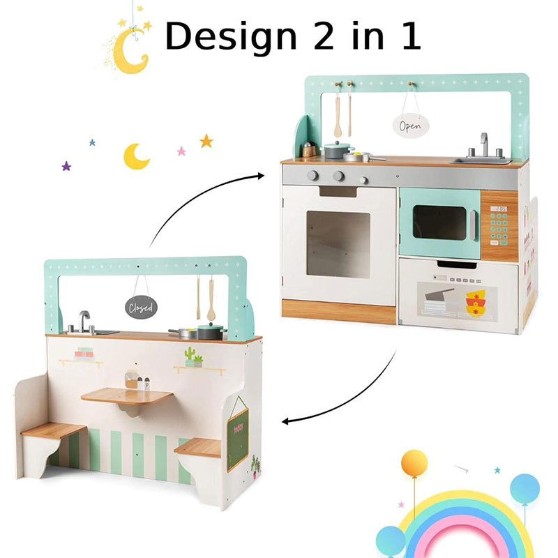 Bring double the fun to playtime with the Costway 2-in-1 Kids Play Kitchen and Restaurant! This versatile wooden playset transforms from a kids’ kitchen into a pretend diner, encouraging creativity, social interaction, and imaginative play.