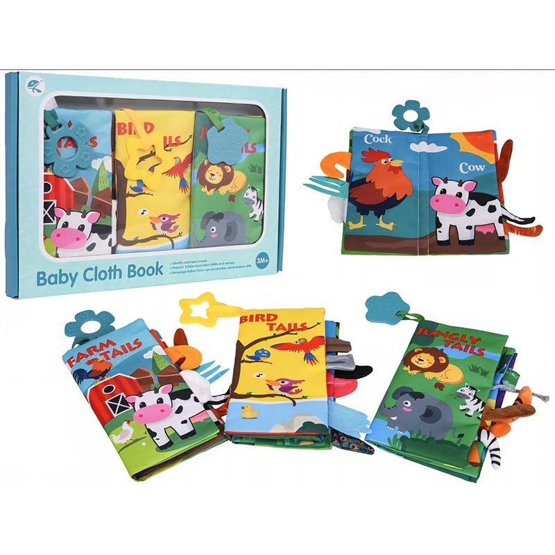 This Baby Cloth Book set includes three soft, interactive books — Farm Tails, Bird Tails, and Jungly Tails. Each book features crinkle sounds, different textures, and fun tails for sensory play. Made from soft fabric, these books help develop fine motor skills and audio recognition.