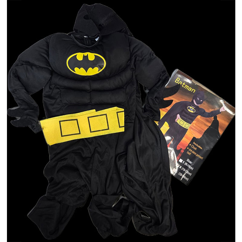 The Children’s Batman Costume features a black one-piece jumpsuit with a muscle chest, yellow utility belt, cloak, and the iconic bat symbol on the chest. Perfect for Halloween, parties, or superhero play.