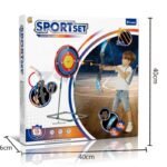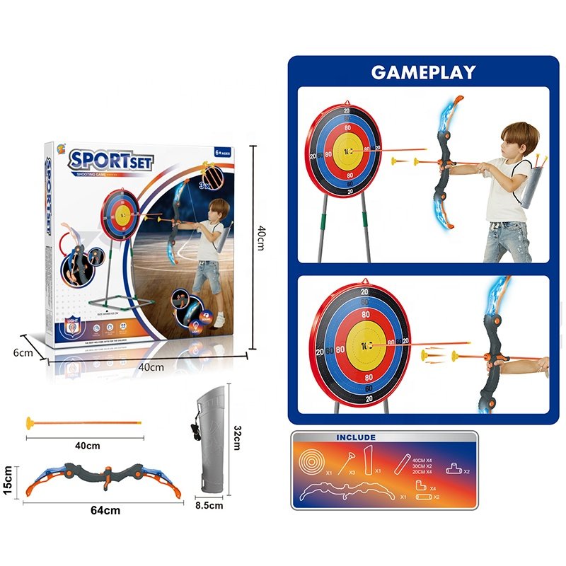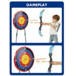 The set typically includes a bow, several suction-cup arrows, a quiver with a strap, and a freestanding target with a point scoring system.