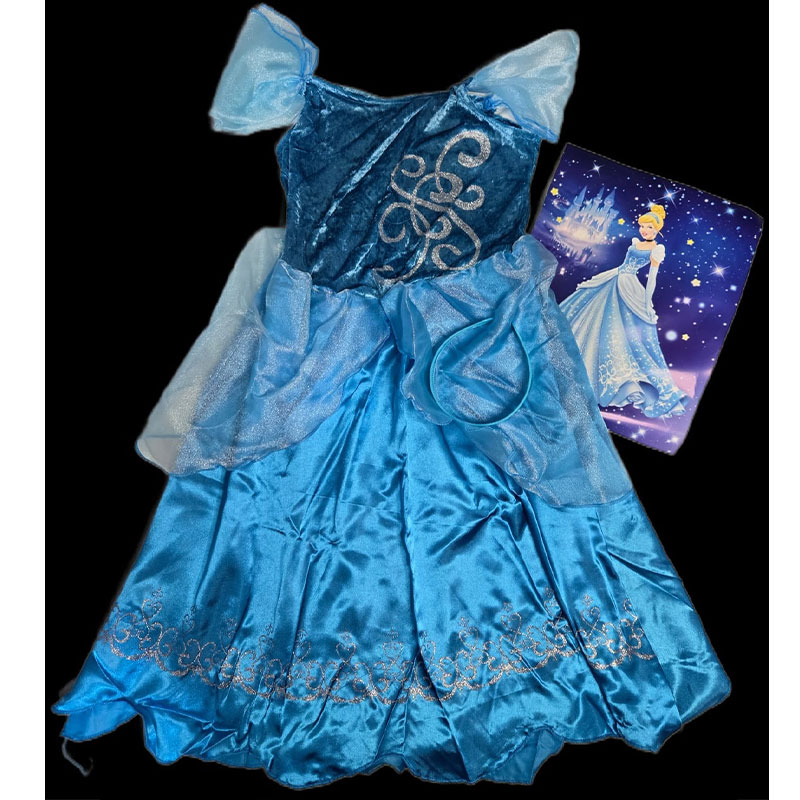 The Cinderella Costume Dress lets children dress up as the beloved Disney princess. This light blue ball gown features puffy sleeves, a long skirt, and a velour or satin bodice with an organza peplum