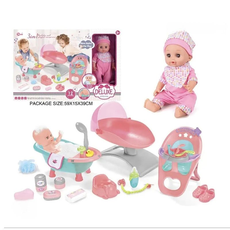 Deluxe 3-in-1 Baby Doll Playset with accessories! Includes a baby doll, bathtub, potty chair, highchair, bottle, slippers, and more. The doll makes sounds and can drink and wet for realistic pretend play.