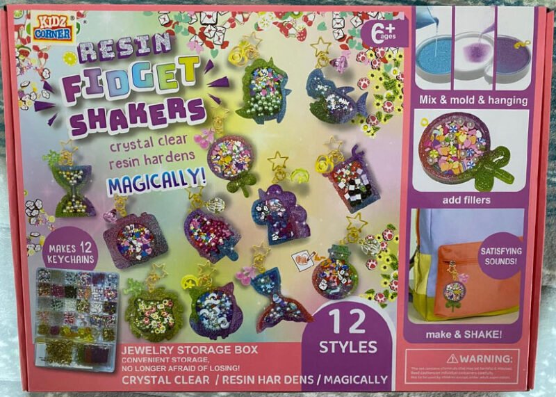 Resin Fidget Shakers Kit – Create 12 crystal-clear resin keychains with molds, fillers, and glitter. Fun DIY craft set for kids aged 6+ with satisfying shakeable designs.