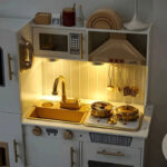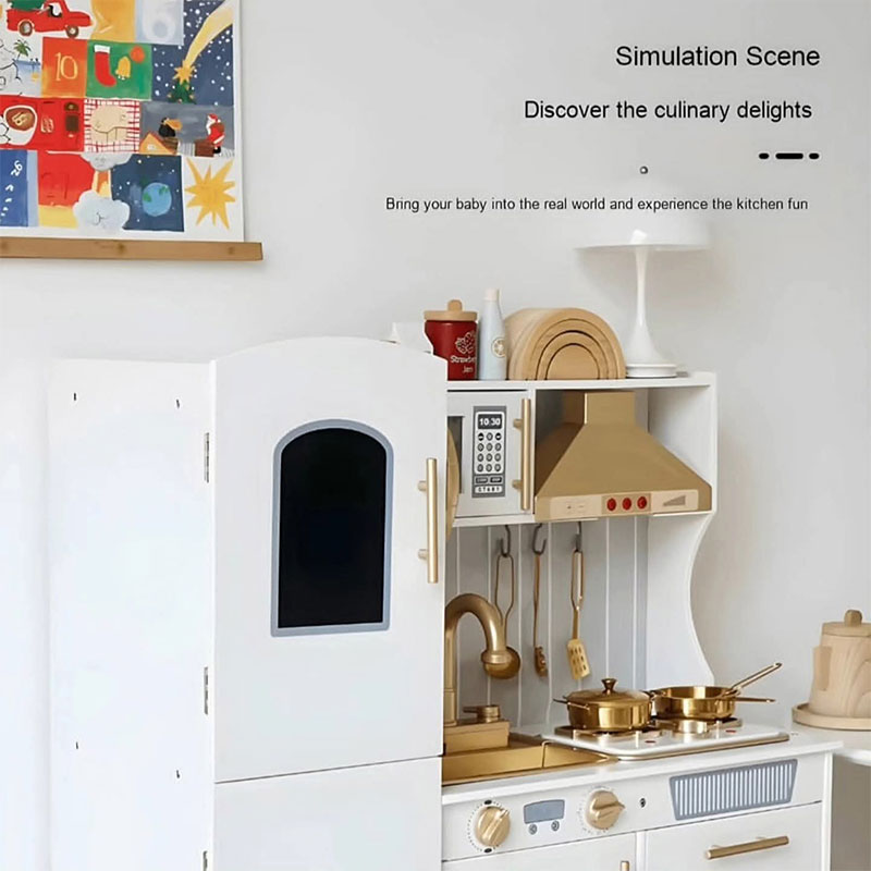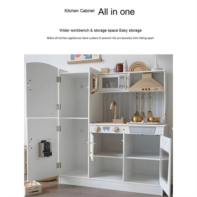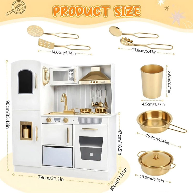 Inspire imaginative play with this beautifully High Quality crafted wooden kids’ play kitchen set. Featuring a realistic stovetop with lights and sound effects, a working faucet with running water, and a range of fun accessories including pots and utensils, it offers endless pretend-cooking adventures. Perfect for developing hand-eye coordination and learning everyday kitchen routines. Measures approximately 90cm (H) x 79cm (W) x 30cm (D) with a 47cm counter height — ideal for young chefs!
