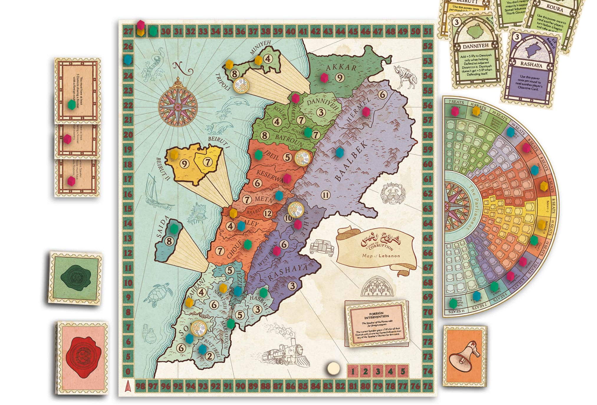 | Lebanon is a country with a rich history and a bright future, but with today’s rampant corruption, we need a reset. “Machrou3 Ra2is” takes you back in time to Lebanon’s golden years and gives you a chance to fix what went wrong and change the course of history. Each player is randomly and secretly assigned a role, either Reformist or Corrupt Elite, and then works on campaigning in the different districts to amass the most seats in the parliament. Would the corrupt succeed in sowing confusion and distrust and bluff their way to power? Or would the reformists be able to see through their game and vote them out? The game of corruption is tricky and treacherous. Do you have what it takes to get to the presidential chair? |