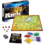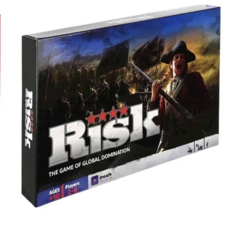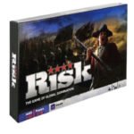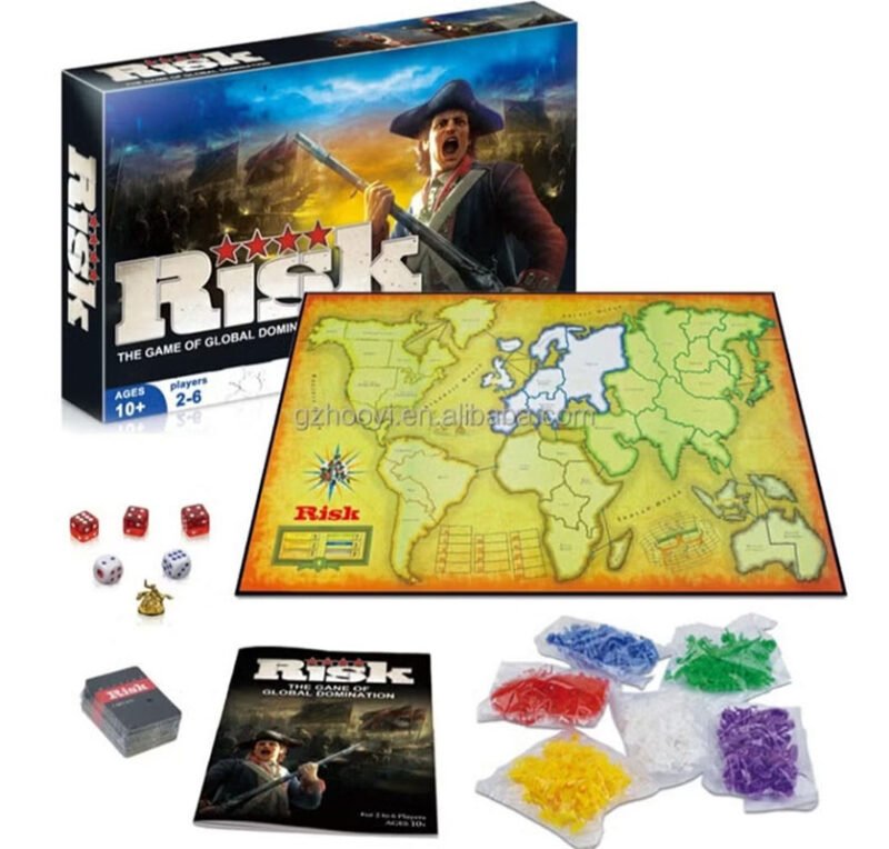 Risk A classic strategy board game for 2–6 players where the goal is to conquer territories and dominate the world. Players take turns placing armies, attacking, and fortifying, using dice to resolve battles. Temporary alliances are allowed, but only one player can win. Games can last 1–8 hours.
