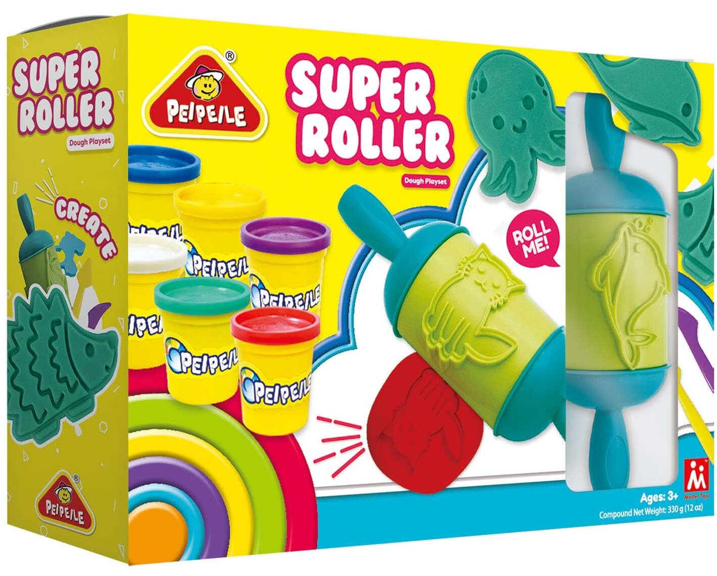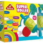 A creative dough playset that includes a roller tool (“Roll Me!”), several pots of colored dough, and various molds (such as an octopus shape).