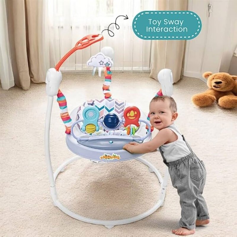 This baby jumperoo is perfect for little ones who can hold their head up but aren’t yet walking. It features a 360° rotating seat, engaging lights, music, and sounds to reward every bounce. Built with a sturdy, free-standing steel frame that doesn’t require a doorway, it’s safe and fun for babies aged 6 months and up, supporting weights up to 15kg.