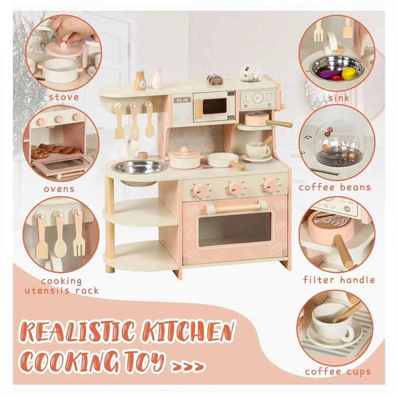 Spark imaginative play with this wooden play kitchen set for kids, crafted from eco-friendly, non-toxic wood. It features a realistic coffee maker, oven, microwave, and sink, along with fun cooking accessories for hours of pretend play. Compact and sturdy, it measures approximately 54cm (H) x 47.5cm (W) x 23.5cm (D). Perfect for little chefs!